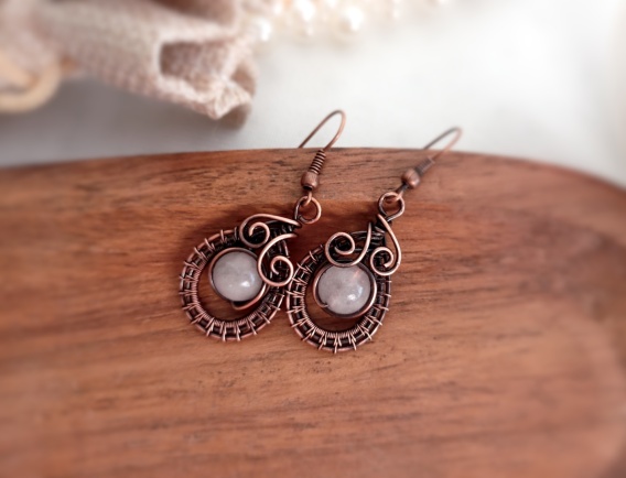 Kolczyki Venti to ręcznie wykonana biżuteria z miedzi i naturalnego różowego kwarcu, inspirowana żywiołem powietrza.